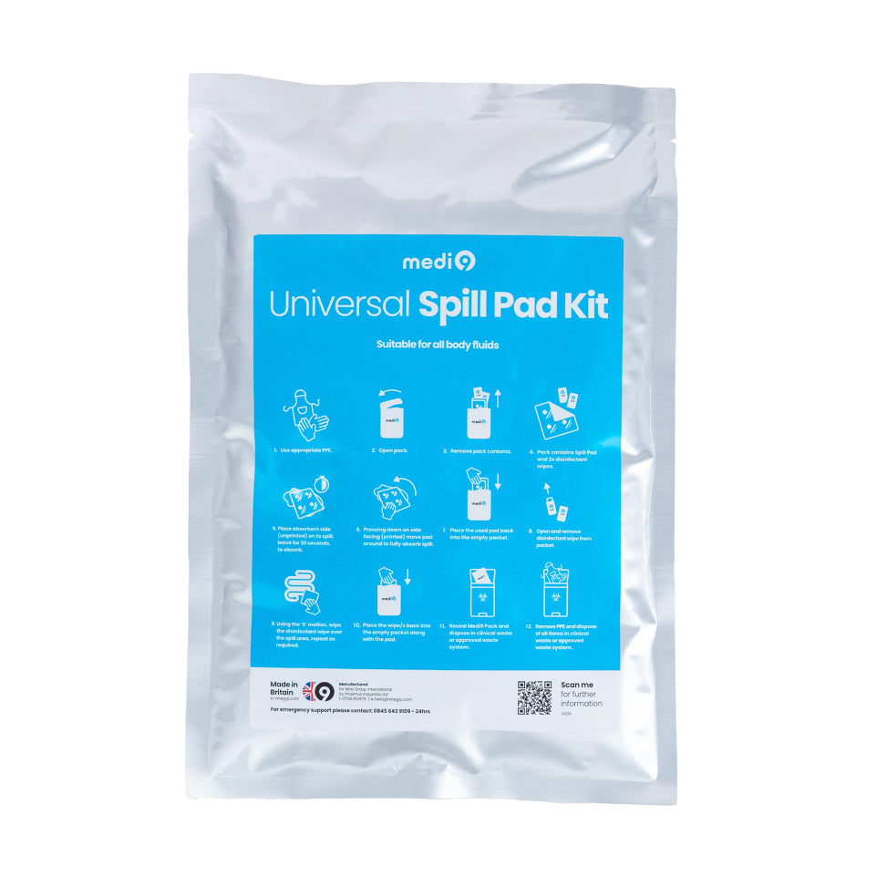 Medi9 Superabsorb Spill Pad Kits are suitable for a variety of spills including body fluids and other biohazards. These kits are Non chlorine-based, odour-free, non-toxic and are safe to use in any environment, including food preparation areas. The kit additionally contains two wipe sachets to disinfect the area once this bill has been removed.