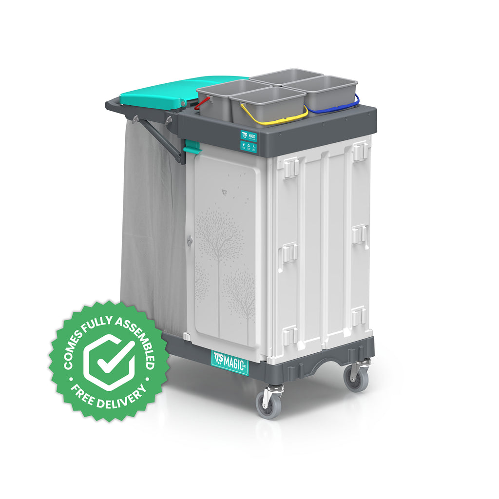 Trolley with 2 areas: 120 L foldable bag holder, closed storage area with drawer. Multipurpose polypropylene trolley, modular and customisable to meet every cleaning need. Ideal to carry cleaning tools in environments with space-saving needs, thanks to the foldable bag holder. [PLEASE NOTE: Bag and lid not included]